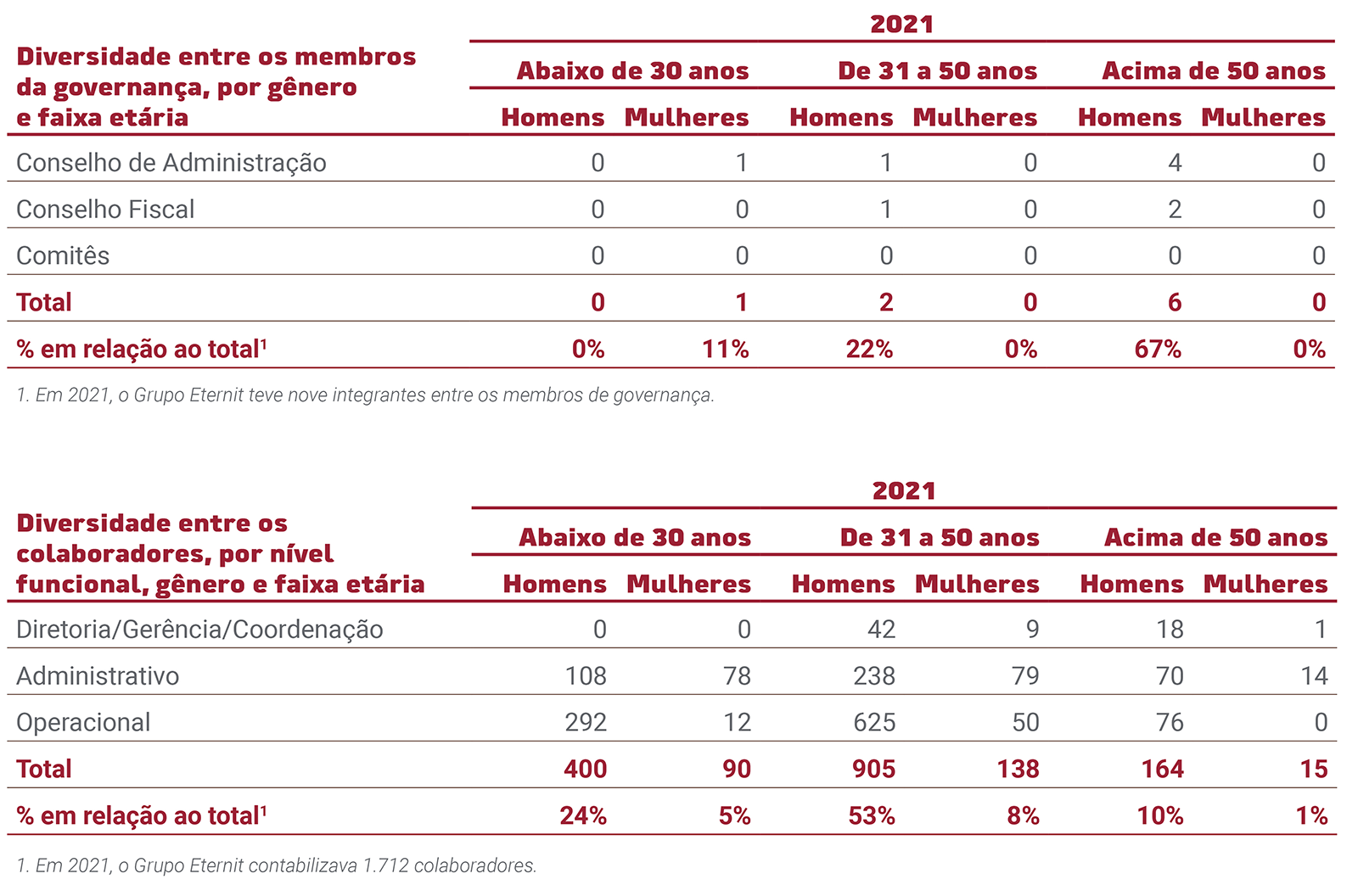 Em 2021, não houve casos de discriminação identificados na Companhia. O Código de Ética da Eternit reforça o compromisso com um ambiente de trabalho livre de discriminações, coações ou ameaças de qualquer natureza. 406-1