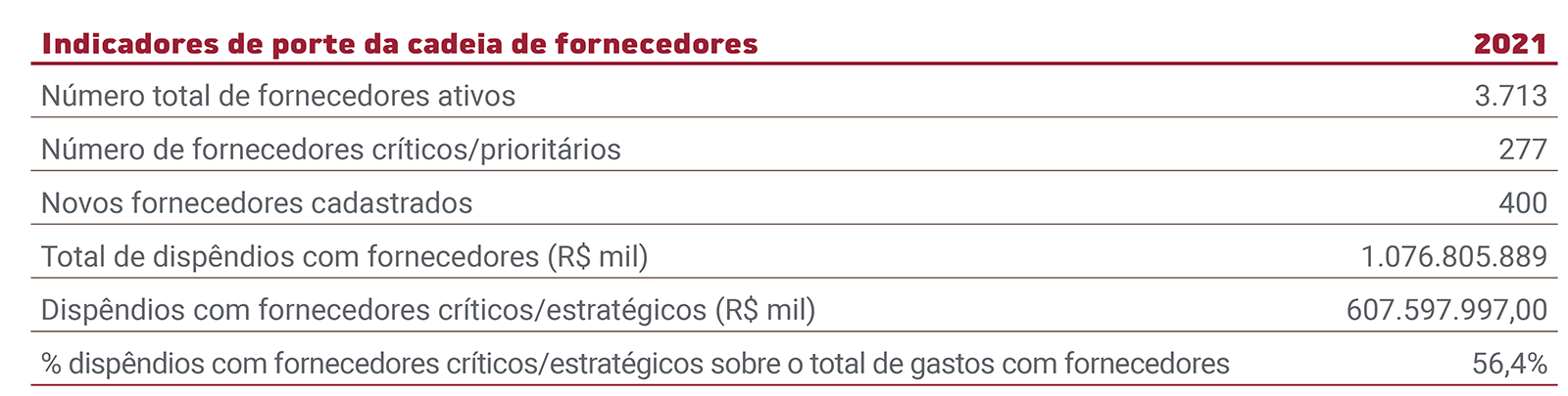 A Companhia informa que busca as melhores práticas de mercado e trabalha para a implementação de um plano de ação estruturado referente ao tema, e provisiona que até o fim do exercício de 2022 formalizará as declarações dos fornecedores críticos, garantindo os principais requisitos de aderência ao Código de Ética.