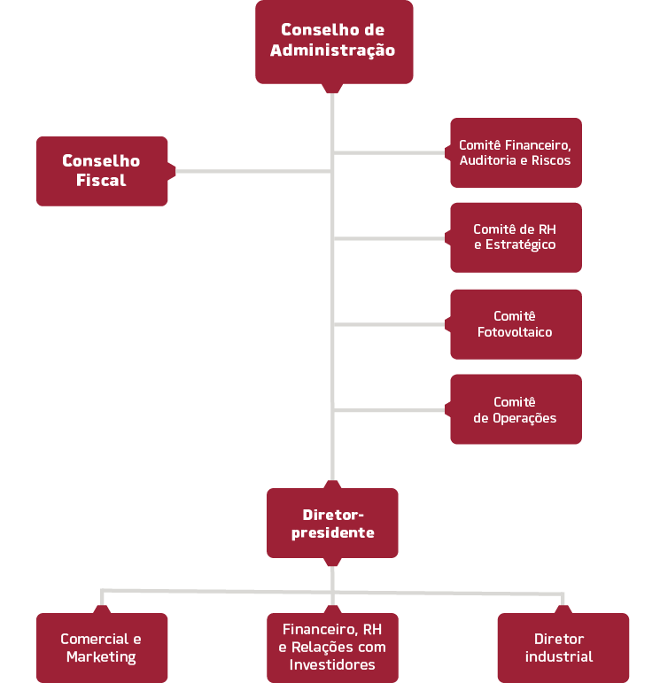 A atuação do Conselho de Administração é apoiada por quatro comitês consultivos: Comitê Financeiro, Auditoria e Riscos, Comitê de Recursos Humanos e Estratégico, Comitê Fotovoltaico e Comitê de Operações. Dessa forma, a Companhia já está aderente ao regulamento do Novo Mercado.